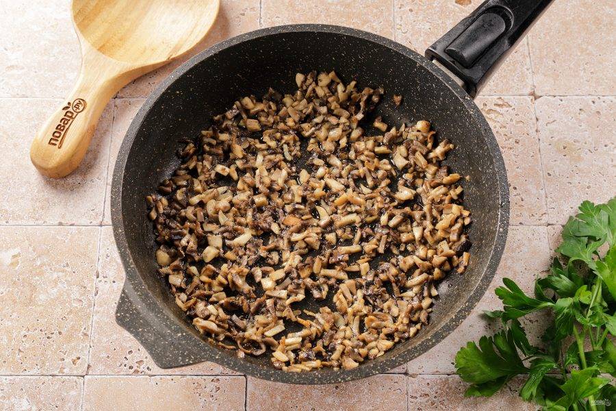 Тем временем шампиньоны нарежьте кубиками и выложите на разогретую сковороду. Когда грибы пустят сок и вода выпарится, добавьте 1 ст.л. растительного масла и подрумяньте в течение пары минут. Посолите и поперчите по вкусу. Переложите обжаренный грибы пока на тарелку.