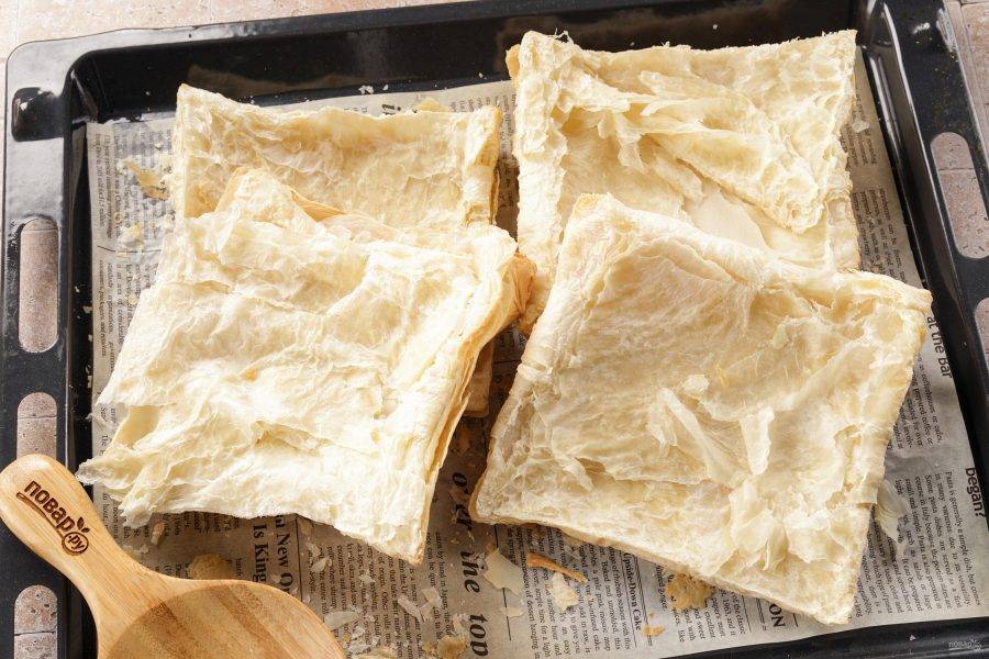 Когда начинка будет готова, разделите каждый квадрат теста пополам. Крошки не выбрасывайте, их можно использовать для украшения. Я так же дополнительно сняла верхнюю румяную корочку. Она хрустящая и легко крошится руками.