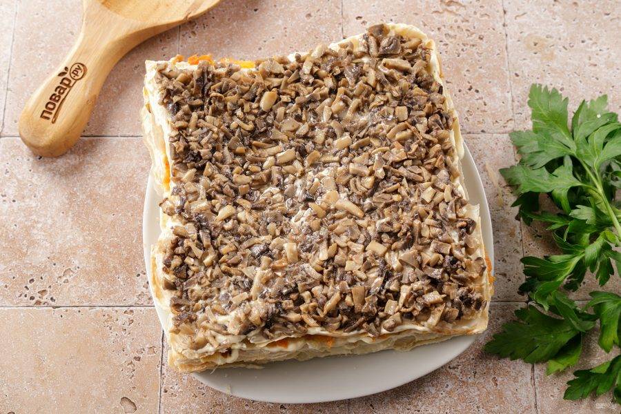 Накройте начинку следующим коржом. Снова хорошо прижмите, смажьте майонезом и выложите начинку из жареных шампиньонов.