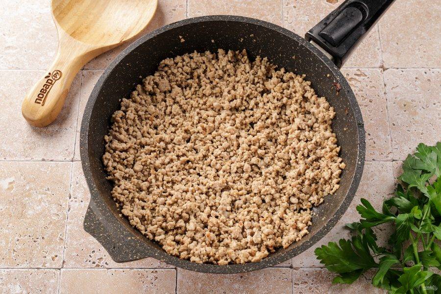 Выложите на сковороду фарш. Добавьте масло если необходимо и жарьте, разбивая комочки фарша лопаткой, около 15-20 минут. В процессе добавьте соль и специи по вкусу.