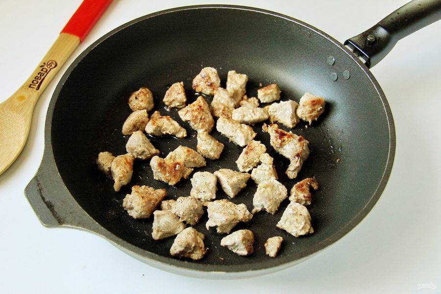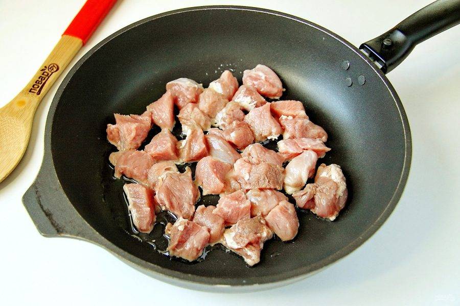 Мясо нарежьте кубиками и отправьте на раскаленную сковороду с маслом.