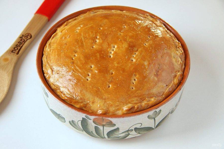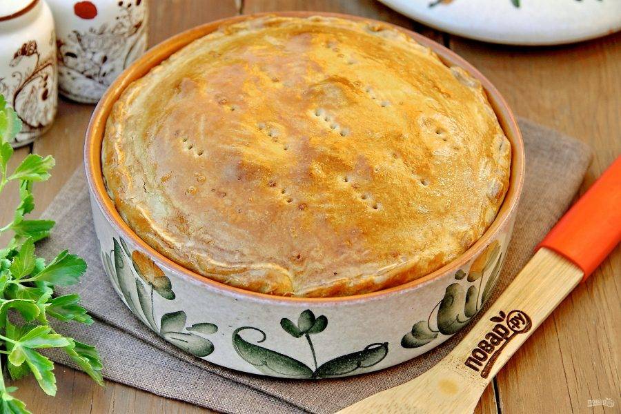 Выпекайте в духовке при температуре 180 градусов около 30 минут. Мясной пай готов.