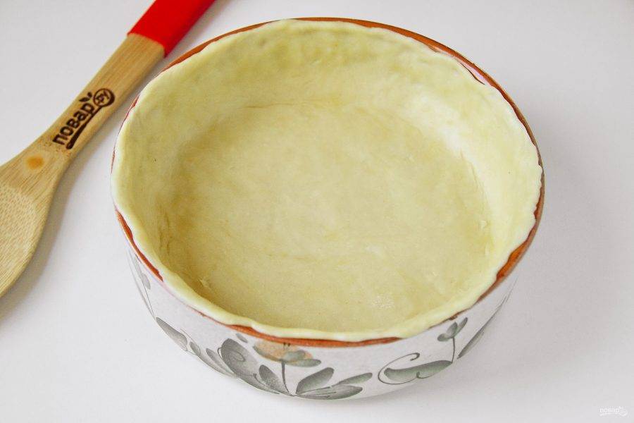 Тесто разделите на две неравные части. Большую часть теста раскатайте по размеру формы, перенесите его в нее и руками сформируйте высокие бортики. Форму для выпечки предварительно смажьте маслом.