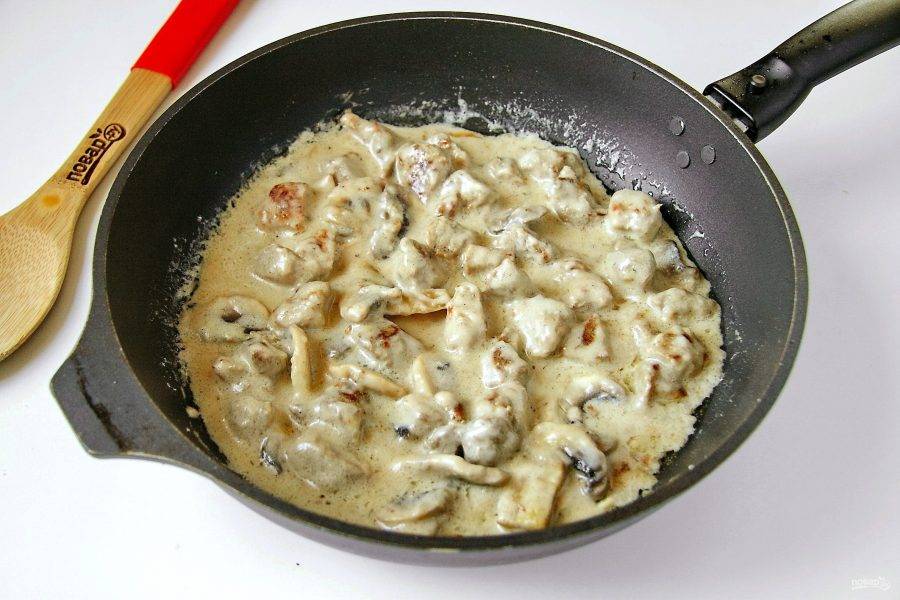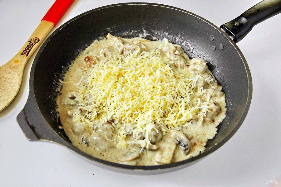 Дайте соусу загустеть, добавьте соль по вкусу и снимите сковороду с плиты. Добавьте в еще горячий соус тертый сыр и быстро перемешайте.