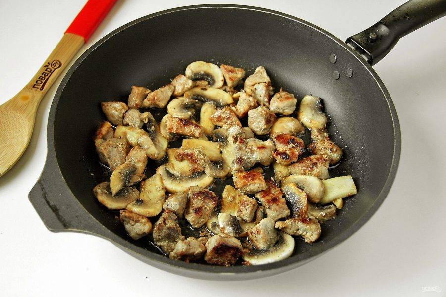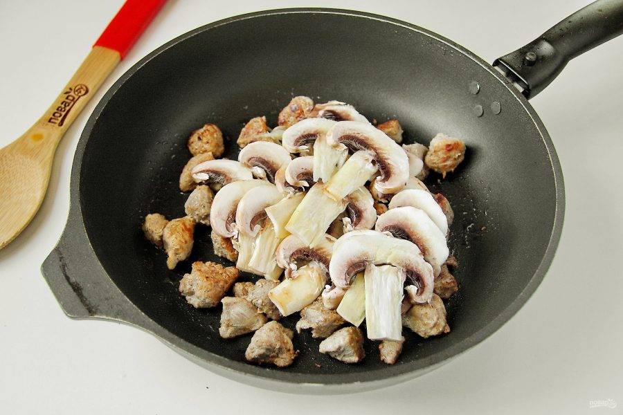 Добавьте к мясу нарезанные шампиньоны или любые другие грибы.
