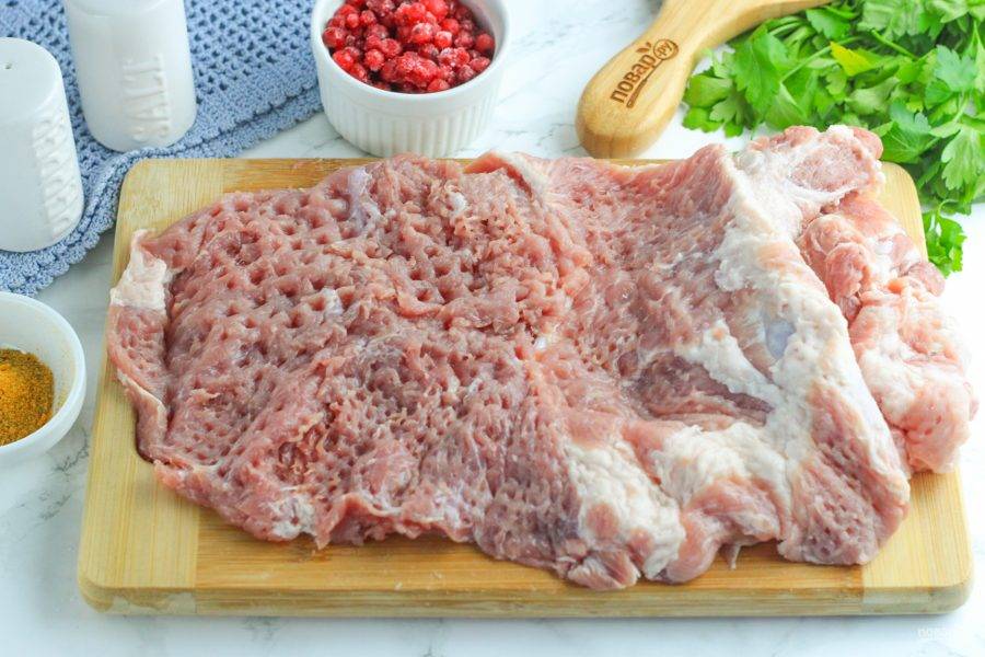Подготовьте указанные ингредиенты. Свинину обязательно используйте сочную, с прослойками сала, лучше всего — вырезку.