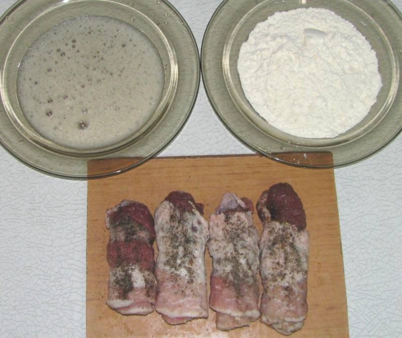 3. Теперь в одну миску насыпаем муку, в другую - яйцо, и чуть его взобьем. Теперь каждый рулетик окунаем сначала в яйцо, а потом в муку. И обжариваем на растительном масле.