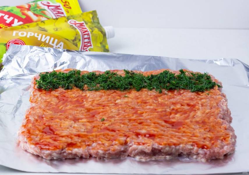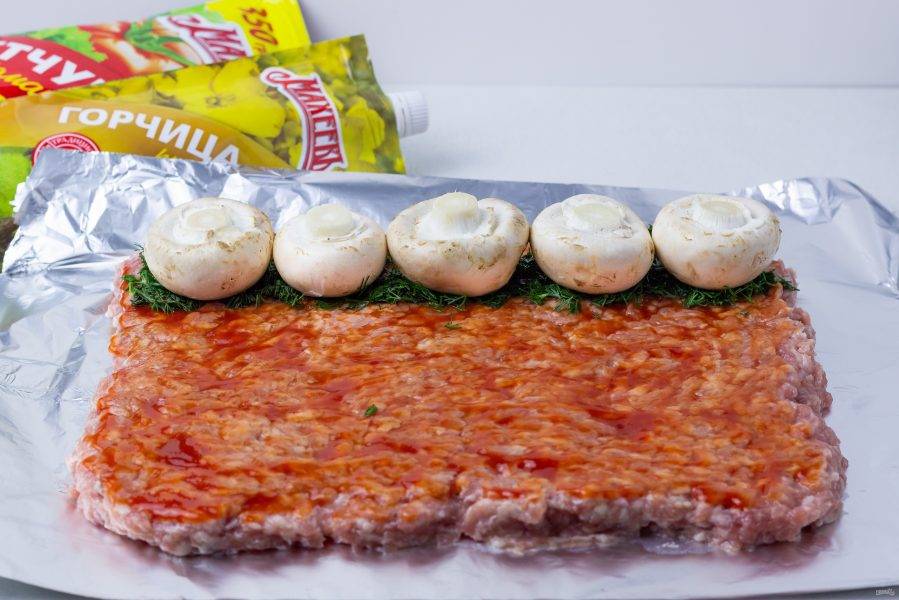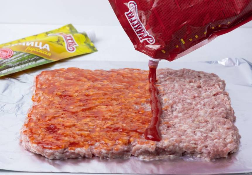 На поверхность фарша тонким слоем нанесите кетчуп.