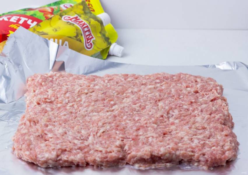 Кусок фольги расстелите на рабочую поверхность и разложите фарш в виде прямоугольника. Высота примерно 1,2-1,5 см.