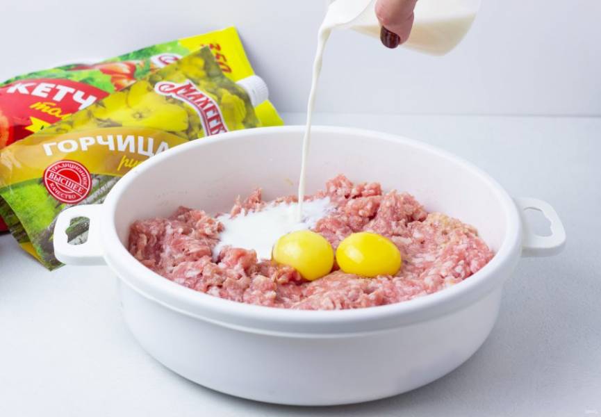 Затем добавьте желтки и молоко, ещё раз вымесите фарш. Без яичных белков рулет получается очень нежным. С белками более плотным и "резиновым".