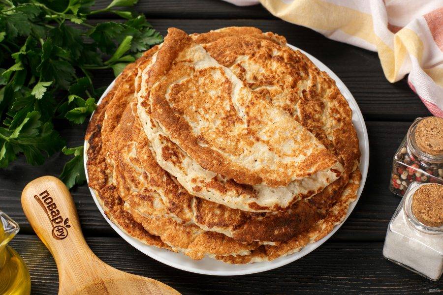 Разогрейте сковороду и смажьте маслом. Диаметр моей сковороды 18 см. Выложите 2-3 ст.л. готовой мясной массы и разровняйте её. Обжарьте блинчики на среднем огне с двух сторон до золотистого цвета.