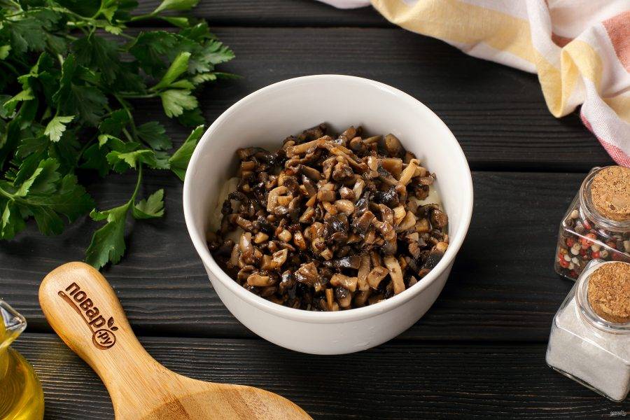 Для второй начинки шампиньоны нарежьте кубиками, посолите и обжарьте до испарения влаги. Дайте немного остыть и соедините с оставшимся сыром и майонезом.