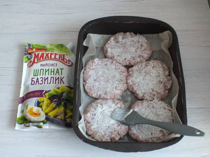 Возьмите форму. Застелите пергаментом. Фарш разделите на 5 частей. Из каждой части сделайте тонкие блинчики. Уложите в форму. Каждый блинчик смажьте майонезом #Махеев "Шпинат Базилик".