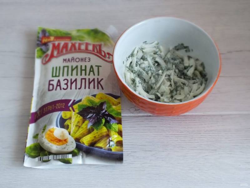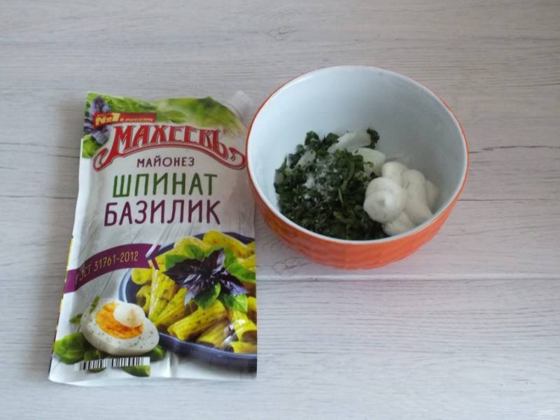Петрушку мелко нарежьте и переложите в чашу. Добавьте нарезанный четвертинками лук, майонез #Махеев "Шпинат Базилик"