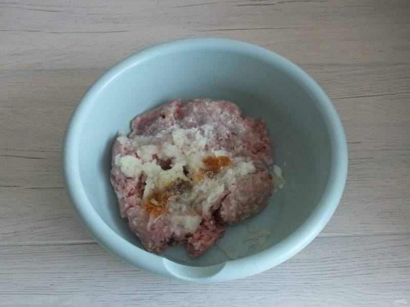 В отдельной чаше смешайте фарш, натертый лук, соль, перец, сливки. Если фарш жидкий, то сливки добавлять нет необходимости. Хорошо вымесите, несколько раз поднимите фарш и ударьте о дно чаши. Включите духовку на 200 градусов.