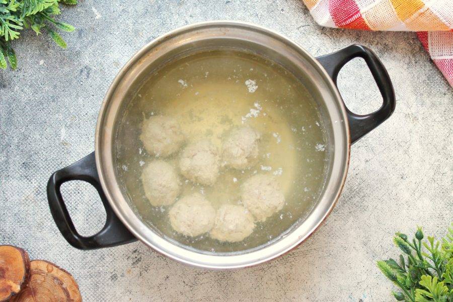 Для отваривания в кастрюлю налейте воду, посолите и доведите до кипения. В кипящую воду выложите фрикадельки и варите до готовности в течение 20 минут.