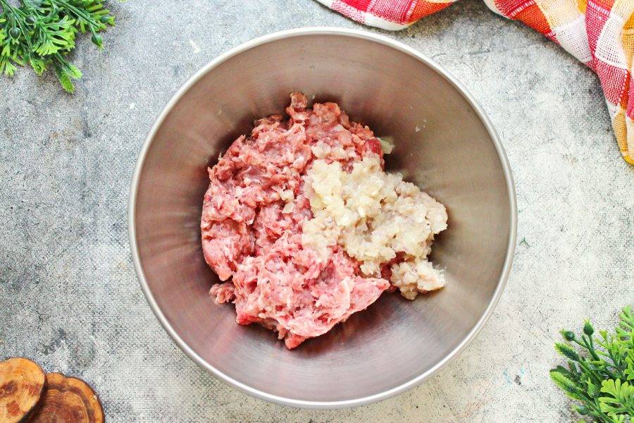 В миску выложите мясной фарш и измельченный репчатый лук. Фарш лучше всего приготовить дома, а репчатый лук измельчить в мясорубке или натереть на крупной терке.