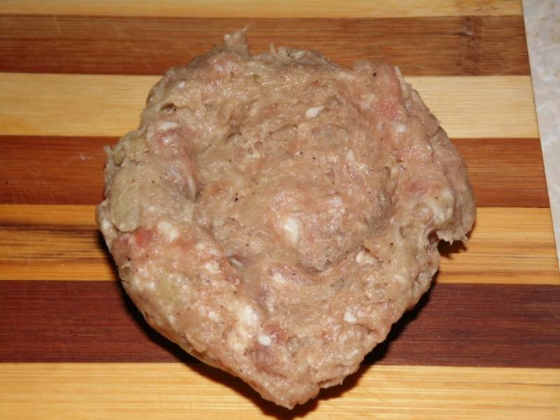 Берем фарш и лепим из него котлетки с углублением внутри.