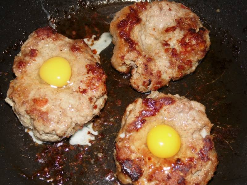 Далее переворачиваем их углублением вверх и вбиваем в углубления по перепелиному яйцу.