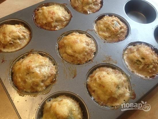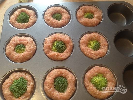 5. Делим фарш на 9-10 шариков и укладываем в формочки для маффинов. По центру вдавливаем брокколи.