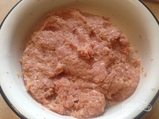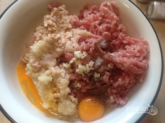 2. Измельчаем через мясорубку хлеб, замоченный в воде или молоке и тщательно отжатый от жидкости, также поступаем с луком. Добавляем к фаршу яйца, соль, перец, хлеб, лук и, по желанию, измельченный чеснок.