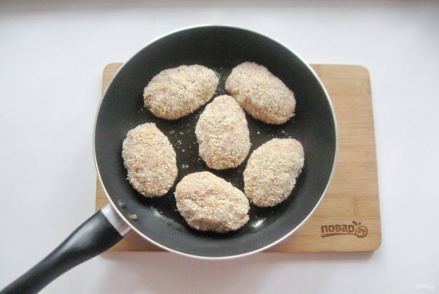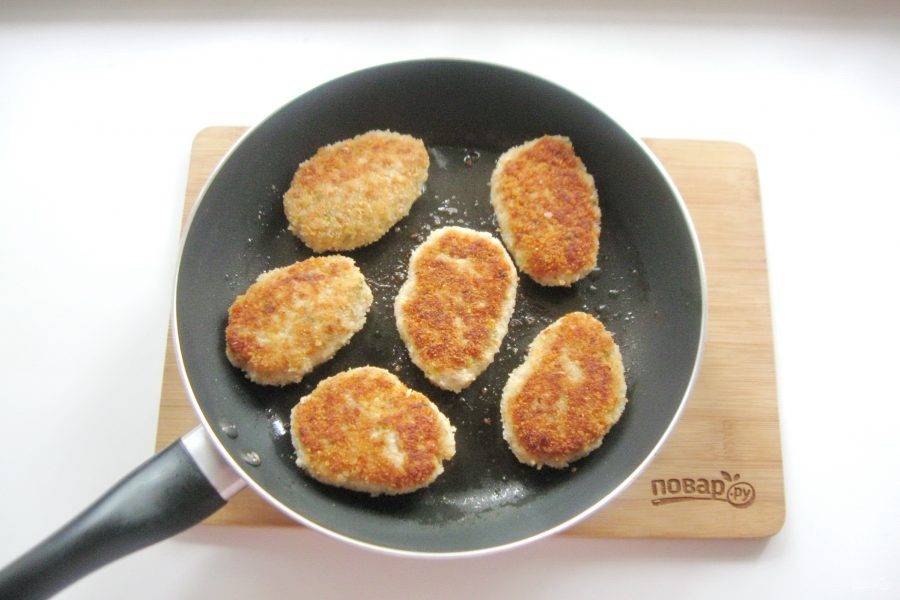 Обжарьте котлеты с обеих сторон до золотистой корочки. После выложите в жаростойкую форму и дополнительно обработайте в микроволновой печи 5 минут или в духовке в течение 10 минут.