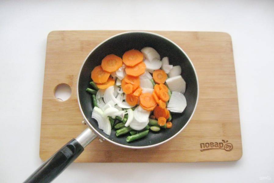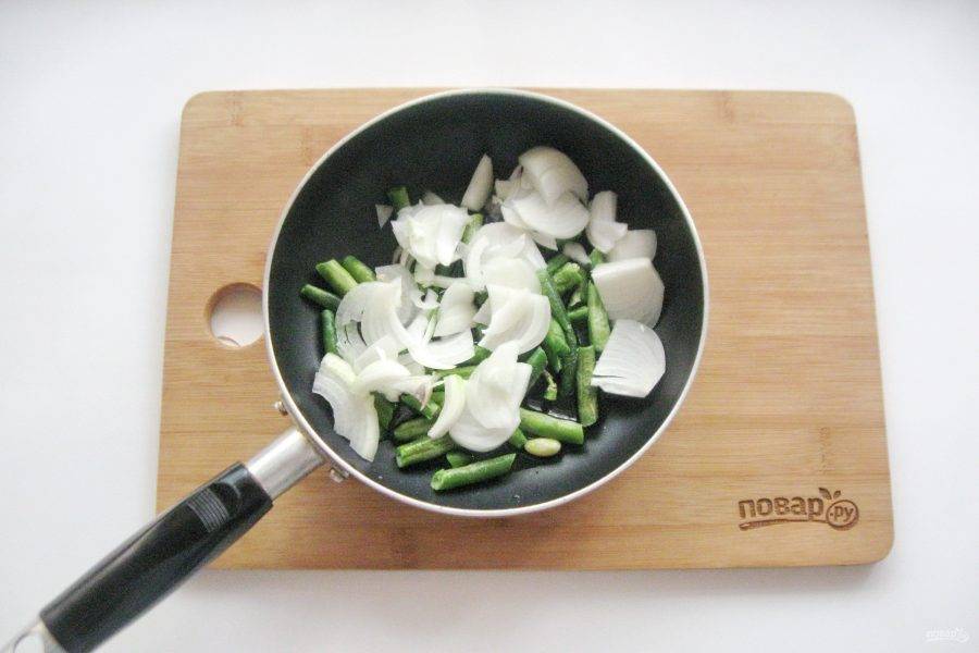 Лук очистите, помойте и нарежьте произвольно. Выложите в сковороду. Зеленую фасоль помойте и добавьте к луку.