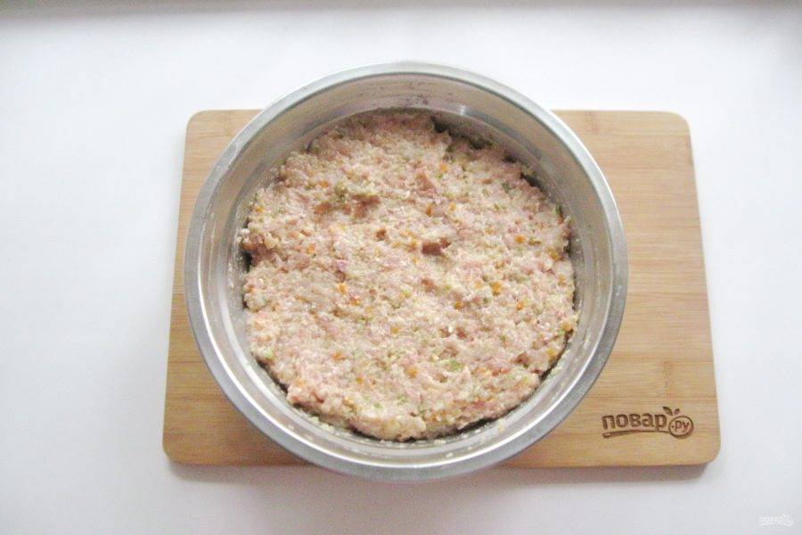 Фарш посолите и поперчите по вкусу, тщательно перемешайте до однородной, немного вязкой консистенции. Можно его взбить блендером.