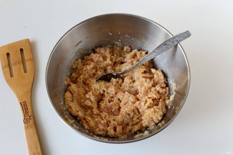 Фарш переложите в глубокую миску. Добавьте отжатый хлеб, тертый на крупной терке лук, яйцо, соль и специи по вкусу.