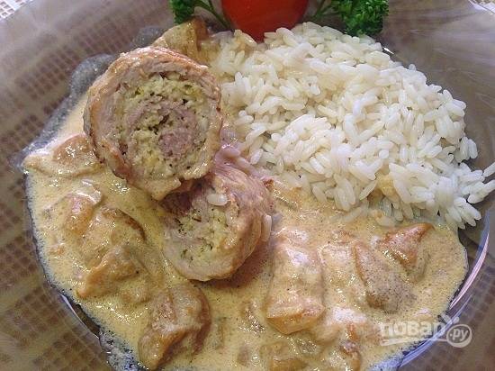Мягкое, нежное мясо с интересной начинкой и густая, ароматная грибная подливка - это блюдо достойно праздничного стола! Готовится несложно, прекрасно сочетается с любым гарниром, да и без него вкусно!