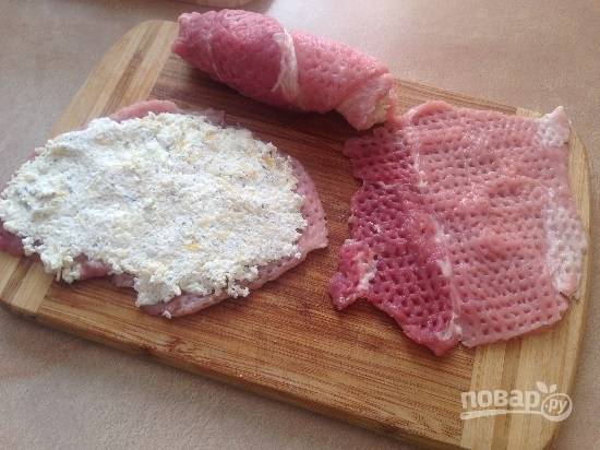 3. Выкладываем начинку на отбивные и заворачиваем рулетики. Края закрепляем деревянными зубочистками. Старайтесь, чтобы начинка не выглядывала из-под мяса.