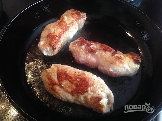 4. Обжариваем рулетики на растительном масле на сильном огне до румяной корочки со всех сторон. Перекладываем рулетики в сотейник.