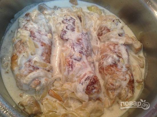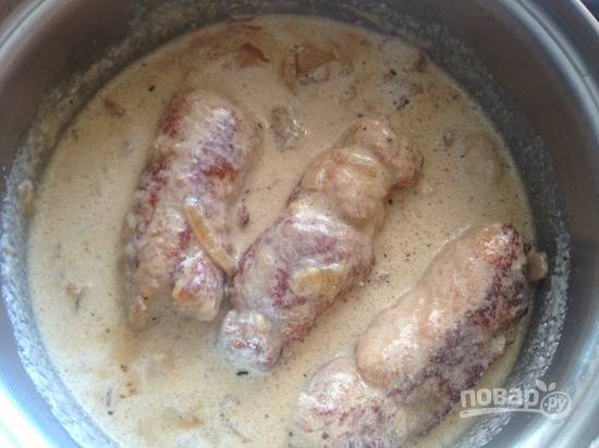 8. Заливаем получившейся подливой рулетики и тушим на маленьком огне под крышкой до полной готовности мяса.