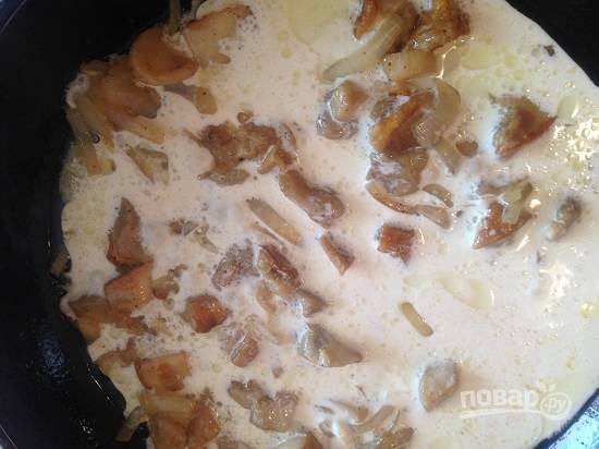 7. Добавим к грибам с луком сливки и воду или бульон. Даем покипеть минут 5. Добавляем по вкусу специи.