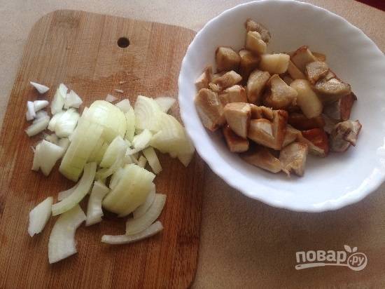 5. Луковицу очистим и нарежем четверть кольцами. Я использую белые замороженные грибы, можно брать любые.