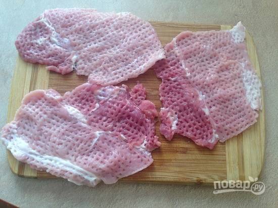 1. Кусочки свинины отбиваем с двух сторон, чтобы получились тонкие отбивные.