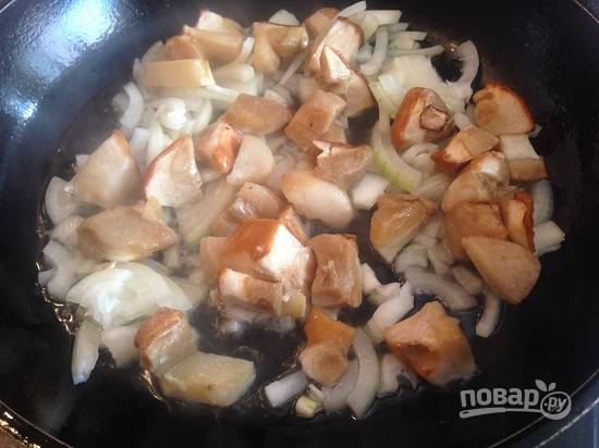 6. На сковороду, в которой обжаривались рулетики, выкладываем лук и грибы, и обжариваем минут 15, посолим и поперчим по вкусу. Если используете шампиньоны, сначала обжарьте лук, а потом добавляйте грибы и готовьте минут 5.