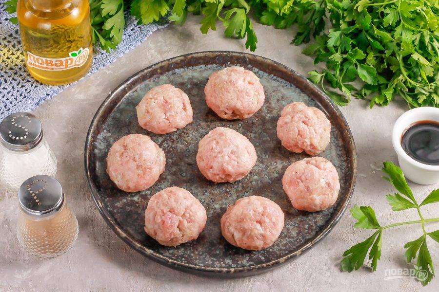 Разделите фарш на равные части и скатайте их в ладонях в колобки, смачивая руки в воде.