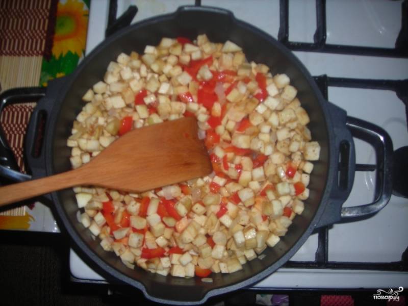 10. К немного поджаренному луку добавить перец и баклажаны.