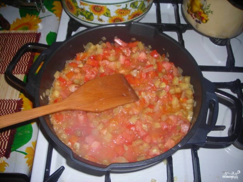 11. Через 5-7 минут добавить помидоры и хорошо перемешать. Овощи должны тушиться в достаточно большом количестве сока. Если сок испаряется быстрее, чем готовятся овощи, добавить немного мясного бульона.
