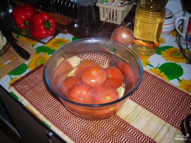 5. На помидорах сделать небольшие надрезы и залить кипятком в глубокой посуде. Подержать 2-3 минуты, затем охладить под проточной водой.