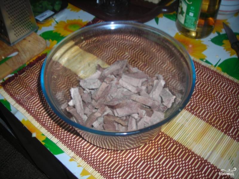 3. Слегка остывшее мясо нарезать соломкой или крупными кубиками.