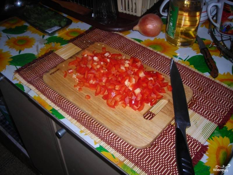 7. Болгарский перец очистить от хвостиков и семян и нарезать мелким кубиком.