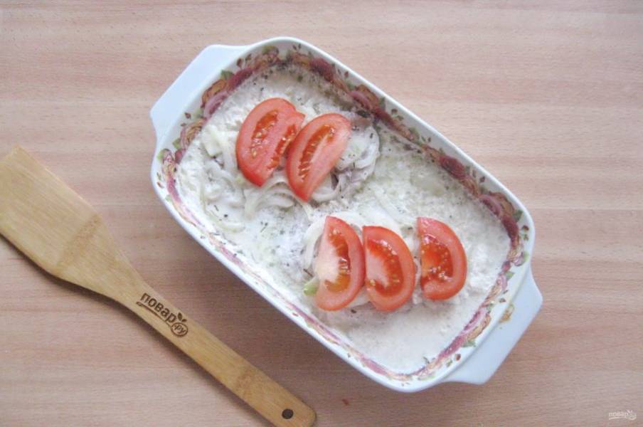 Затем снимите фольгу с формы. Помидоры нарежьте пластинами и выложите на мясо.