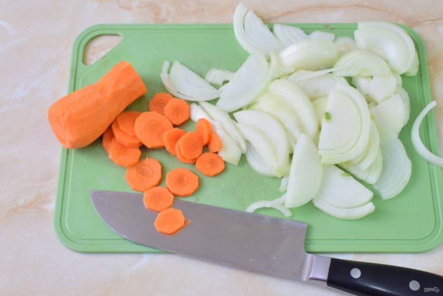 Лук и морковь очистите от кожуры и ополосните от загрязнений. Нарежьте лук полукольцами, а морковь кружочками.