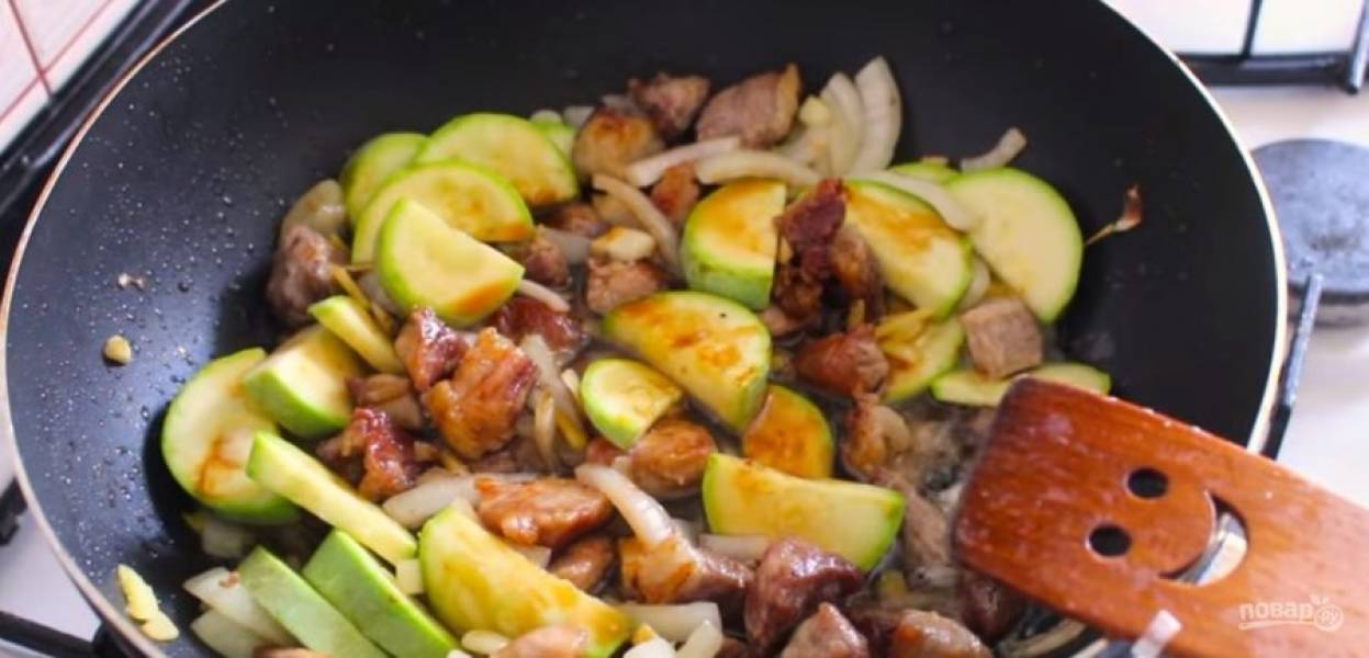 2. Лук нарежьте четвертькольцами. Кабачок нарежьте полукружочками. К мясу добавьте овощи, жарьте еще в течение 5 минут, периодически помешивая. Добавьте соевый соус, перец и соль по вкусу.