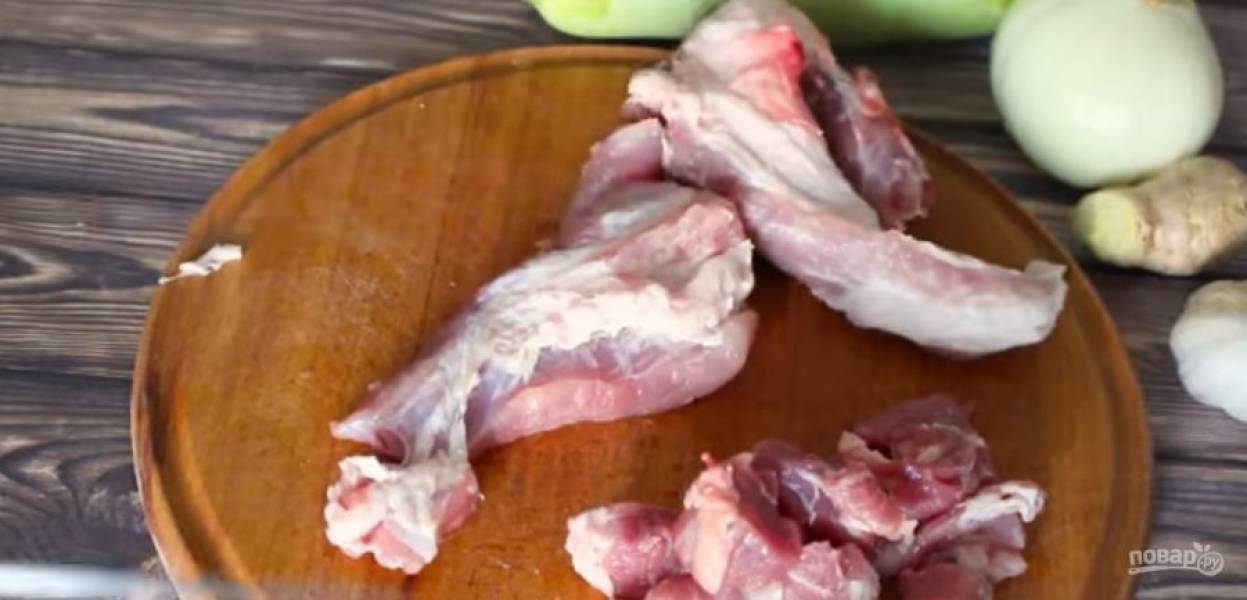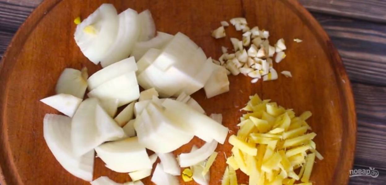 1. Свинину нарежьте кусочками среднего размера и обжарьте на среднем огне на растительном масле до золотистой корочки. Мелко нарежьте имбирь и чеснок.