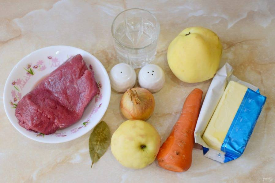 Чтобы приготовить мясо по-осеннему, подготовьте необходимые ингредиенты. Пропорции можно немного изменить на свой вкус.
