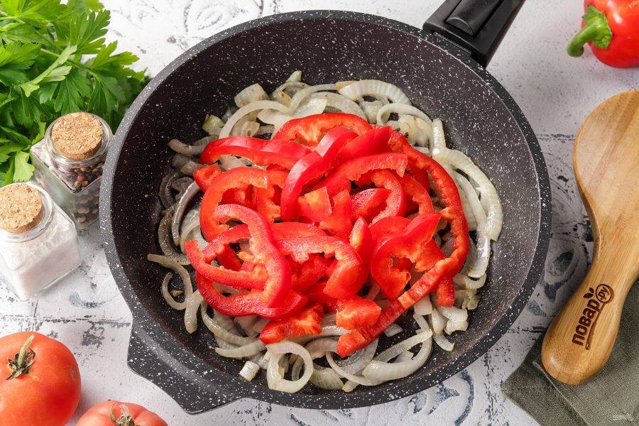 Добавьте нарезанный полосками болгарский перец и готовьте ещё 2 минуты.