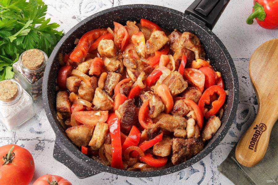 Затем добавьте нарезанные дольками помидоры, измельчённый чеснок и паприку.